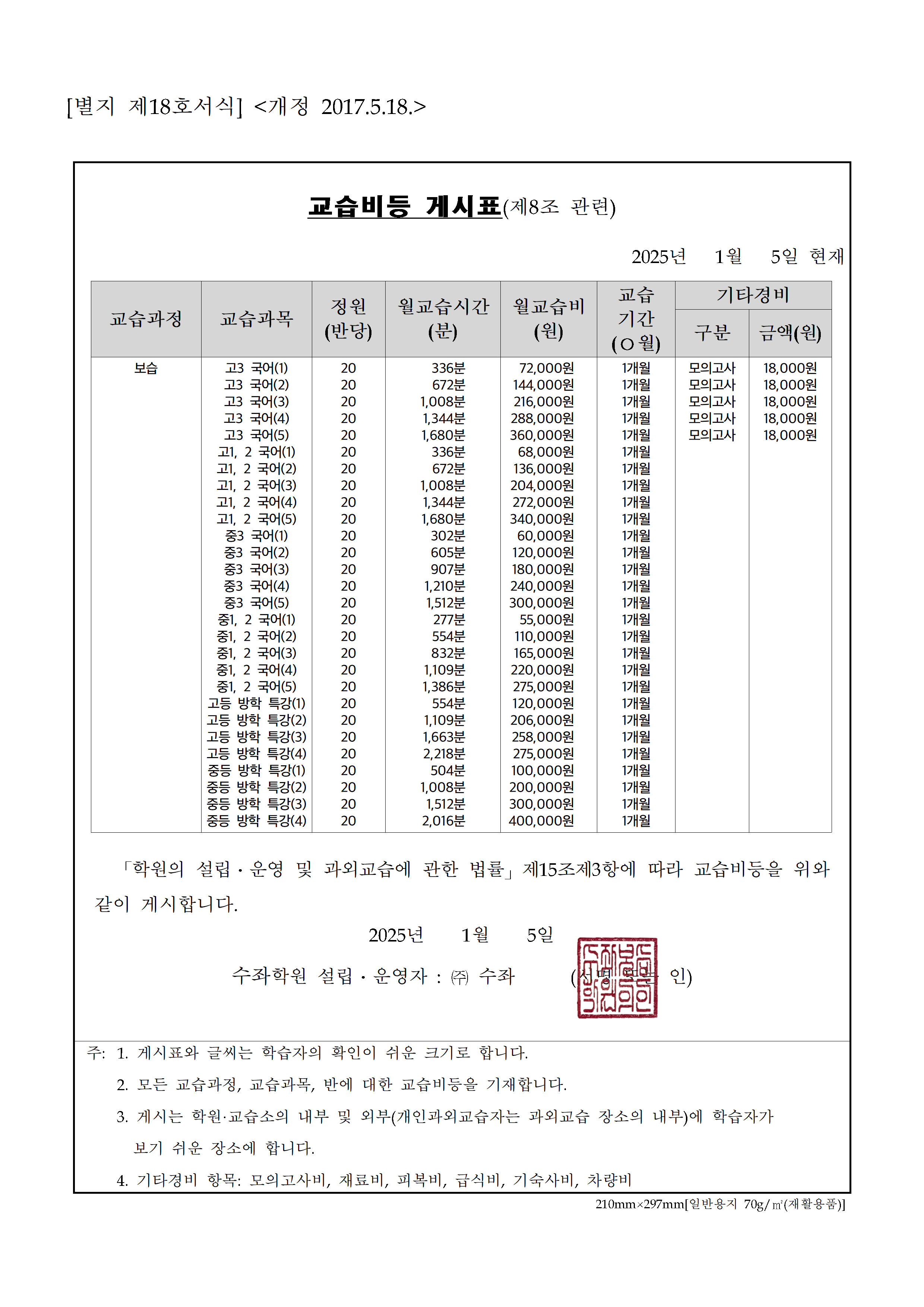 교습비 공지